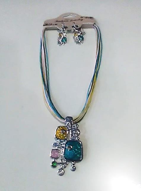 Conjunto de collar y pendientes combinable con camiseta o blusa de cuello irregular o rectangular desbocado o redondo.