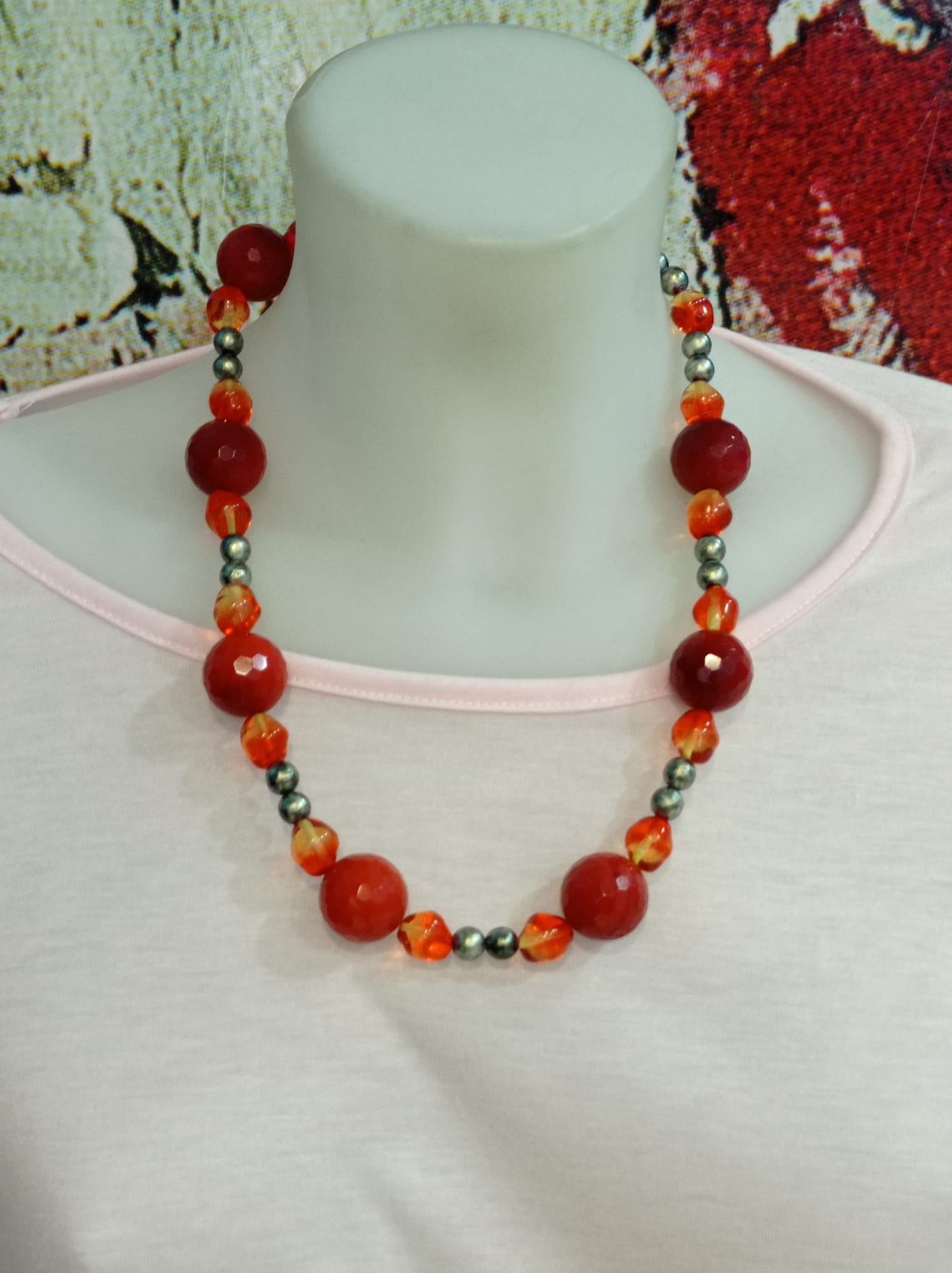 Collar corto, tipo gargantilla, compuesto de bolas de distintos tamaño en tonos rojizos y algun negro. Toque elgante para tus outfits casuales. Con un outfit negro queda TOP TOP.