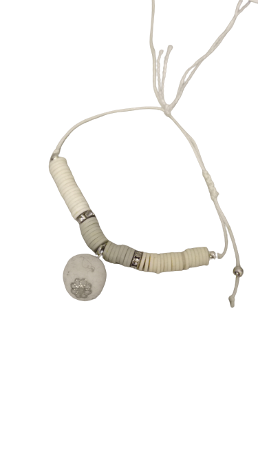Pulsera hecha de hilo extensible, con pompon en en centro en tonos grises. Unisex