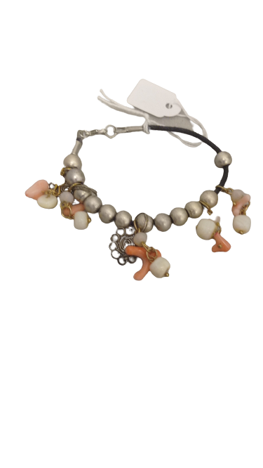 Pulsera hecha de bolas de metal plateado y cuentas color coral