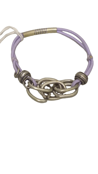 Pulsera de cuerda elastica rematada con aros o cadenas entrelazadas. Color lila.