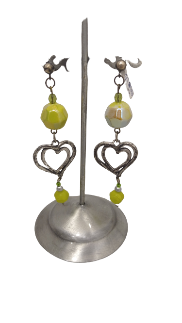 Pendientes con perla verde mostaza y terminado en corazon dentro de corazon.