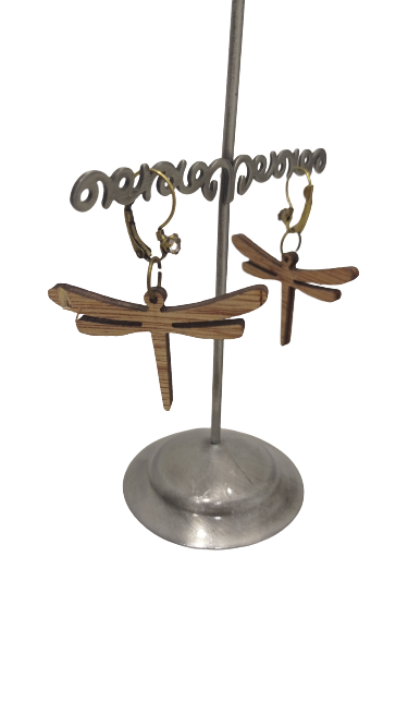 Pendientes hechos de madera barnizada en marron, formando una libelula.