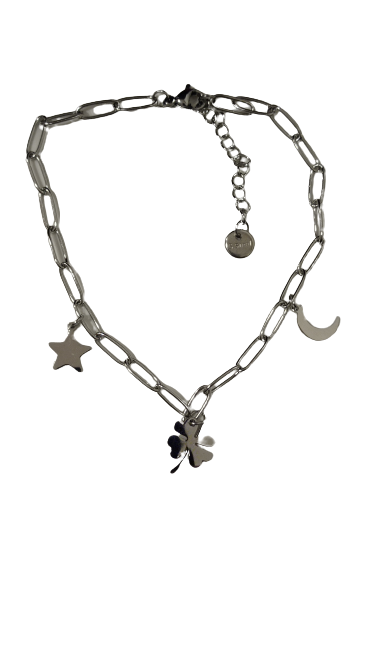 Pulsera de acero quirúrgico plateado, con cadena de eslabones amplios. Lleva tres tipos de colgantes, estrella, trébol de cuatro hojas y luna.