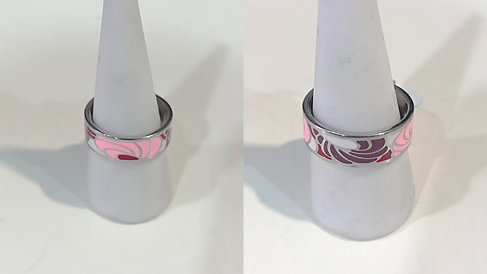 • Anillo de acero esmaltado en tonos rosados con motivos vegetales