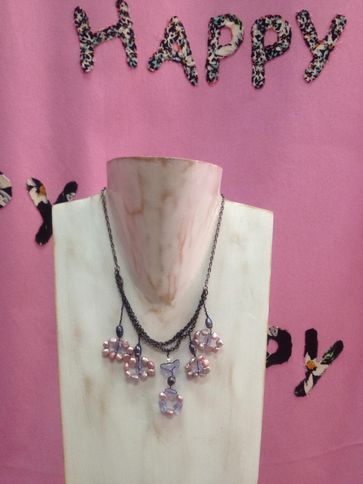 Original collar con flores colgando en color malva hecho con perlas y metal. Toque especial para tus outfits con el contraste de color negro, rosa y malva.