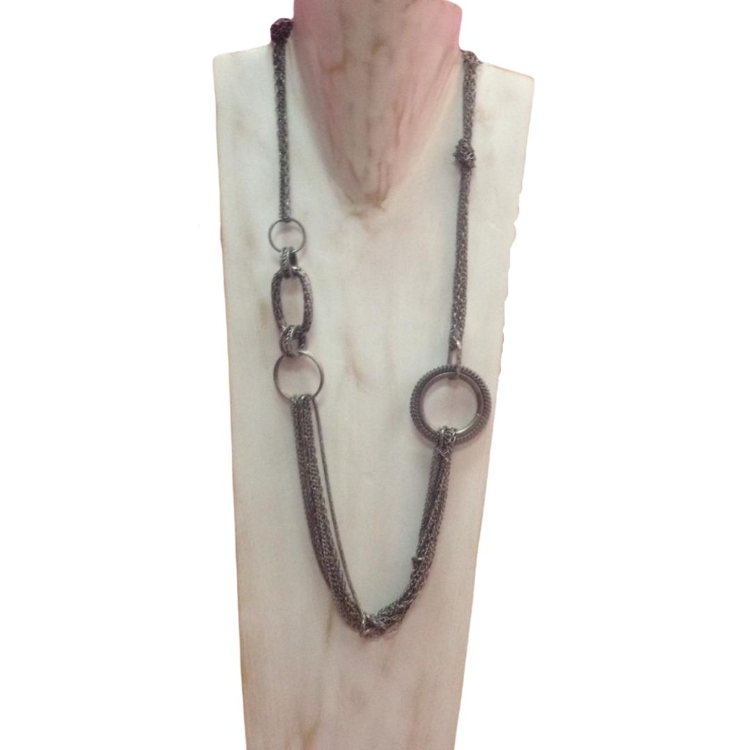 Collar largo compuesto de varias cadenas y aros. Da un toque extremado a tus outfits casuales, e incluso un toque rockero.