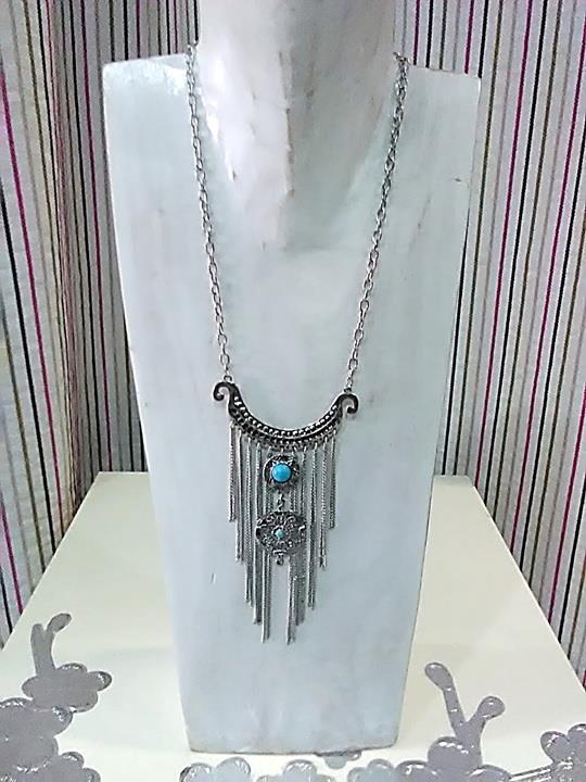 Collar plateado, con flecos de metal decorado con una piedra azul. Extremado para dar un toque diferente a tus outfits.