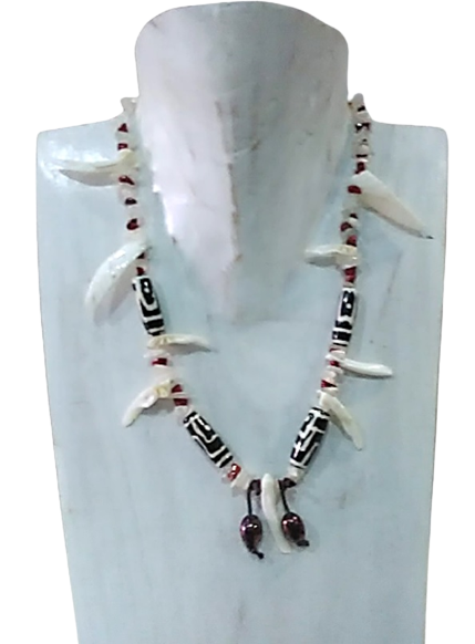 Collar gargantilla llamativo, inspirado en motivos étnicos, destacando los colmillos imitando el marfil. El conjunto combina tonos blanco roto con marrones.