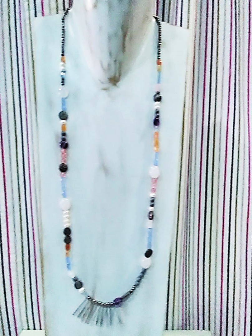 Este collar alterna piedras de colores azules y beig, con laminas plateadas. Combina con distintos outfits, para dar un toque elegante a tus outfits.