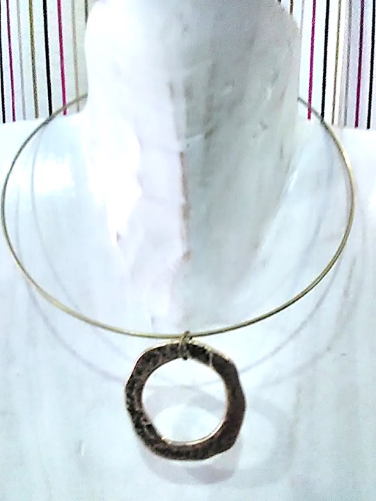 Gargantilla con arandela irregular colgando en color bronce añejo, de la colección de edición limitada Happy. Da un toque especial a una blusa con cuello en colores lisos o estampados.