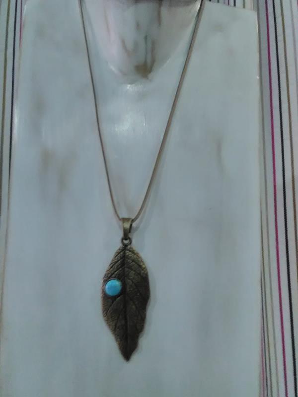 Collar largo, con una hoja alargada cobriza en relieve, rematada con un detalle de piedra azul. Es una pieza de edición limitada Happy, y puedes escoger el largo del collar.