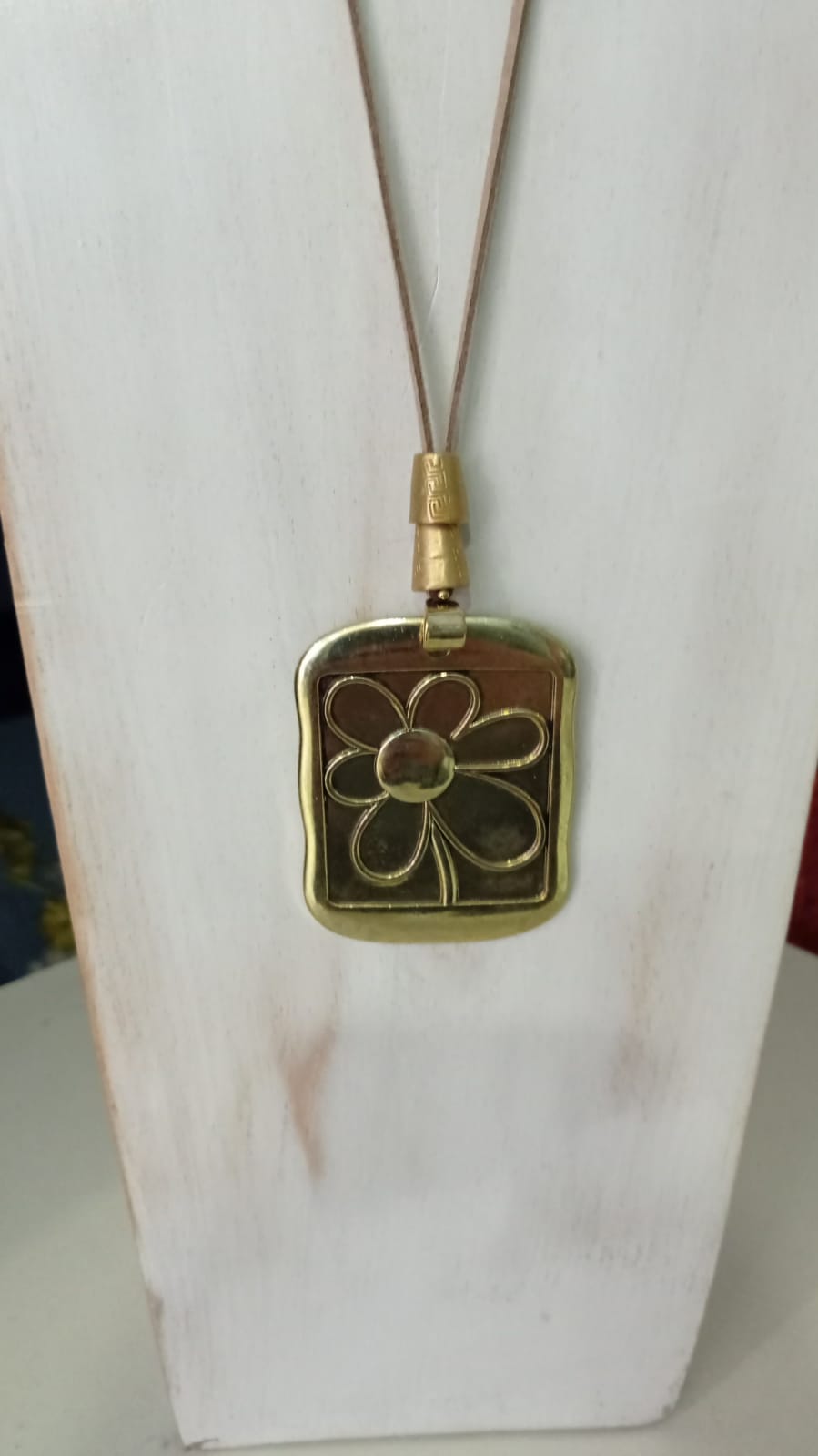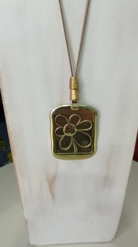 Original rectángulo enmarcando a una margarita en relieve. Este complemento dorado queda muy bien con una blusa o jersey blancos. El collar forma parte de la colección de edición limitada de Happy.