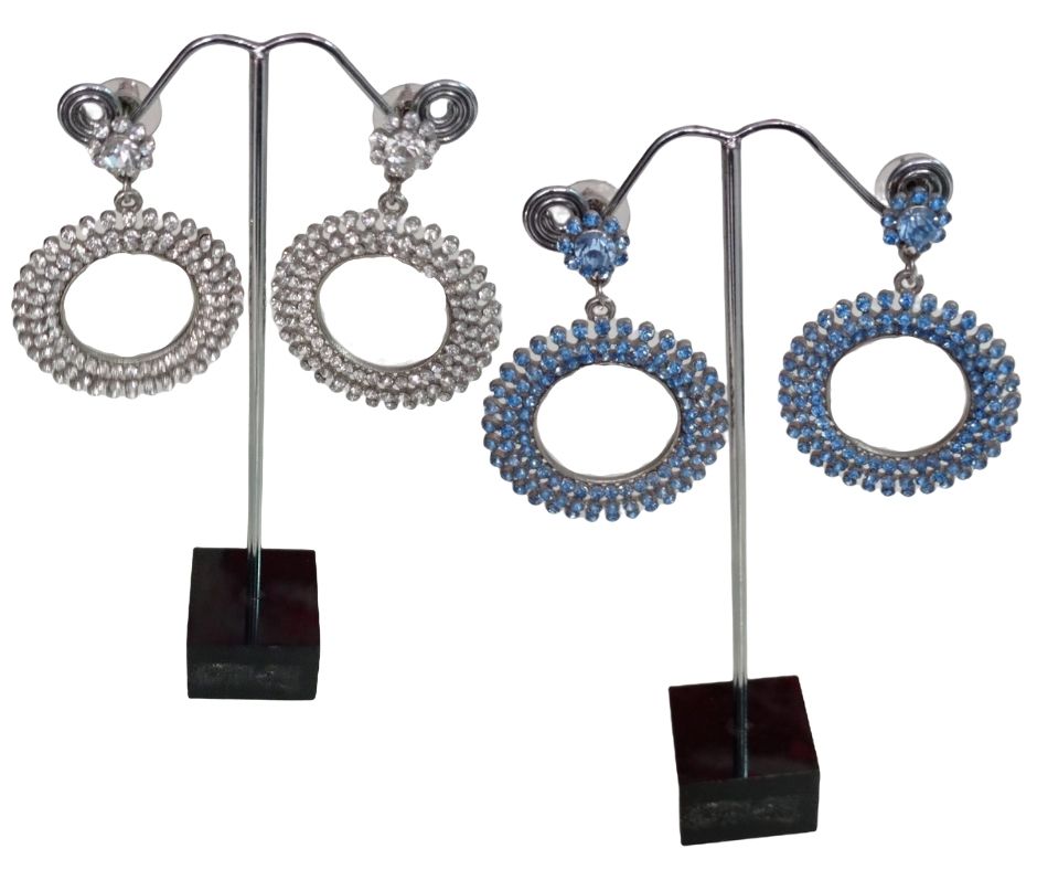 Pendientes de aro estrecho difuminado por pedrería brillante de color blanco plateado o azul cielo.