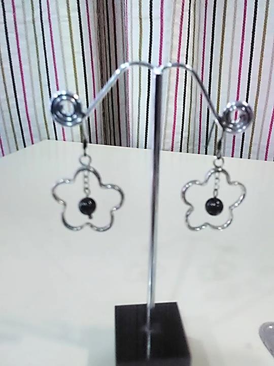 Simpáticos pendientes plateados, con perfil de flor colgando y piedra negra en el centro. Dan un toque juvenil a tu outfit casual.