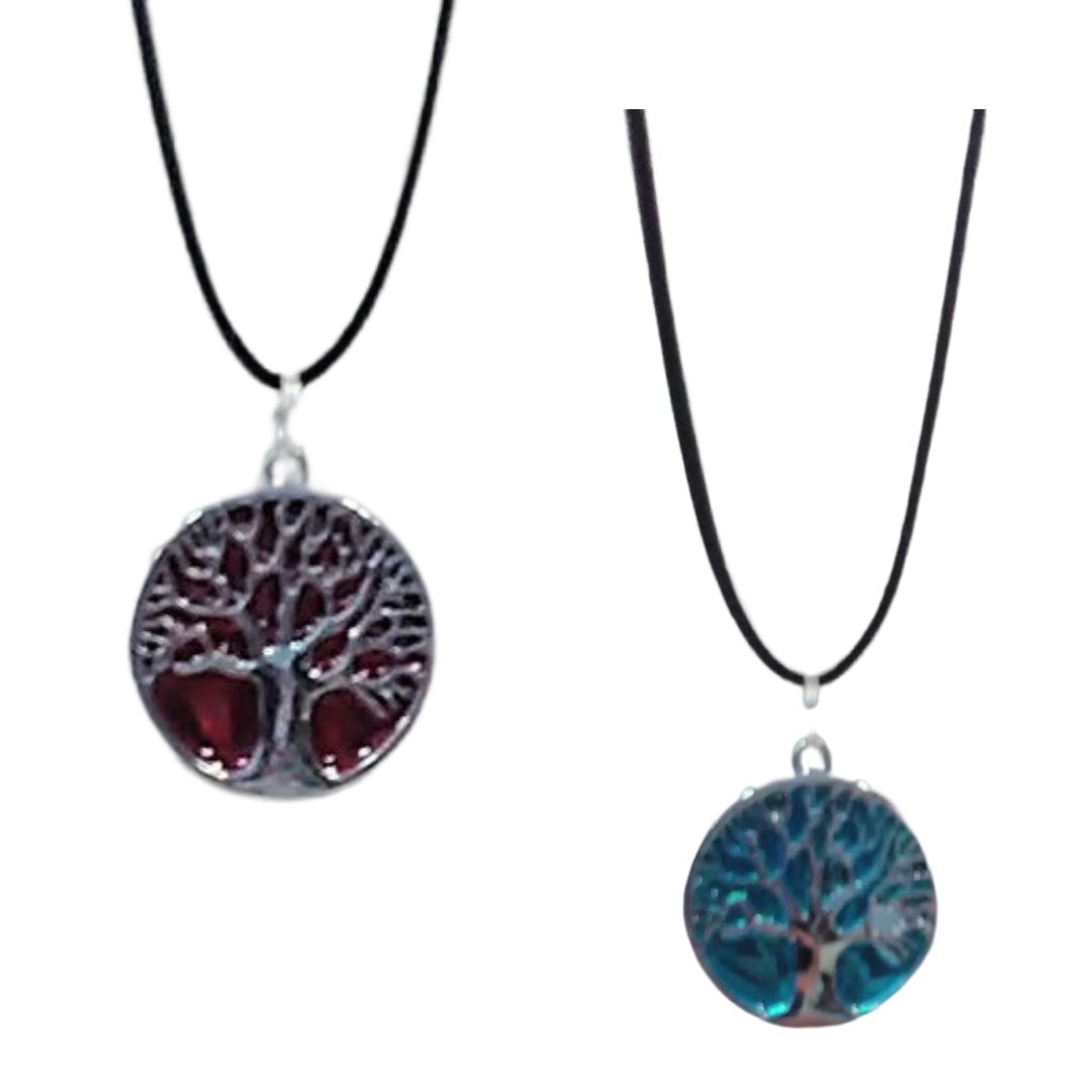 Ligero y discreto medallón con el árbol de la vida plateado. El fondo es rojo o azul. ¿Cuál prefieres?
