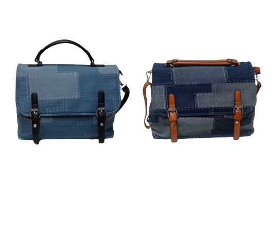 Bolso en bandolera de tamaño medio-grande. Forrado en ropa vaquera. Con bolsillo externo detras. En el interior dos compartimentos y y cuatro bolsillos.