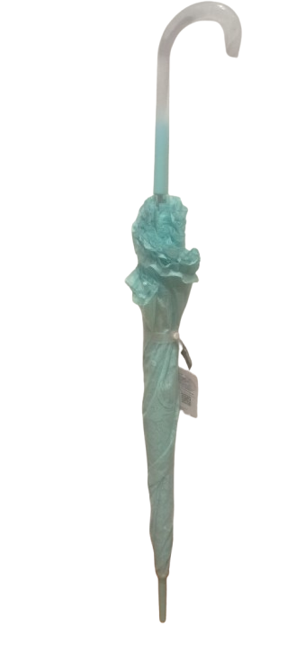 Paraguas original en tono verde agua y puntillas, de plástico semitransparente, estilo sombrilla. Alto doblado incluye apoyo 92 cm. Alto interior 85 cm. Diámetro Interior 103 cm. Desarrollo copa 121 cm.