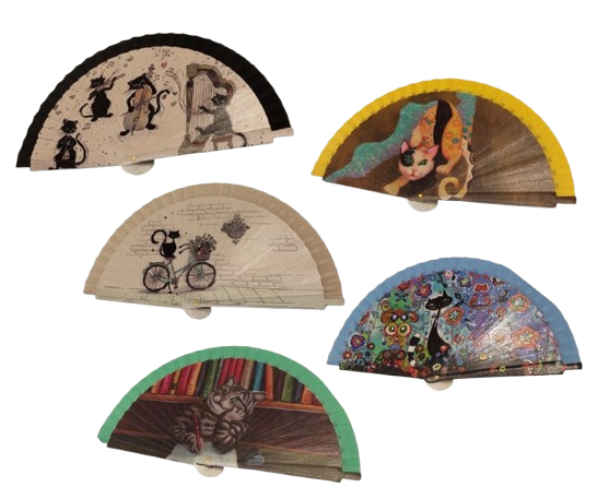 Abanico de madera pequeño. Tamaño bolsillo. Con diferentes dibujos con gatos.