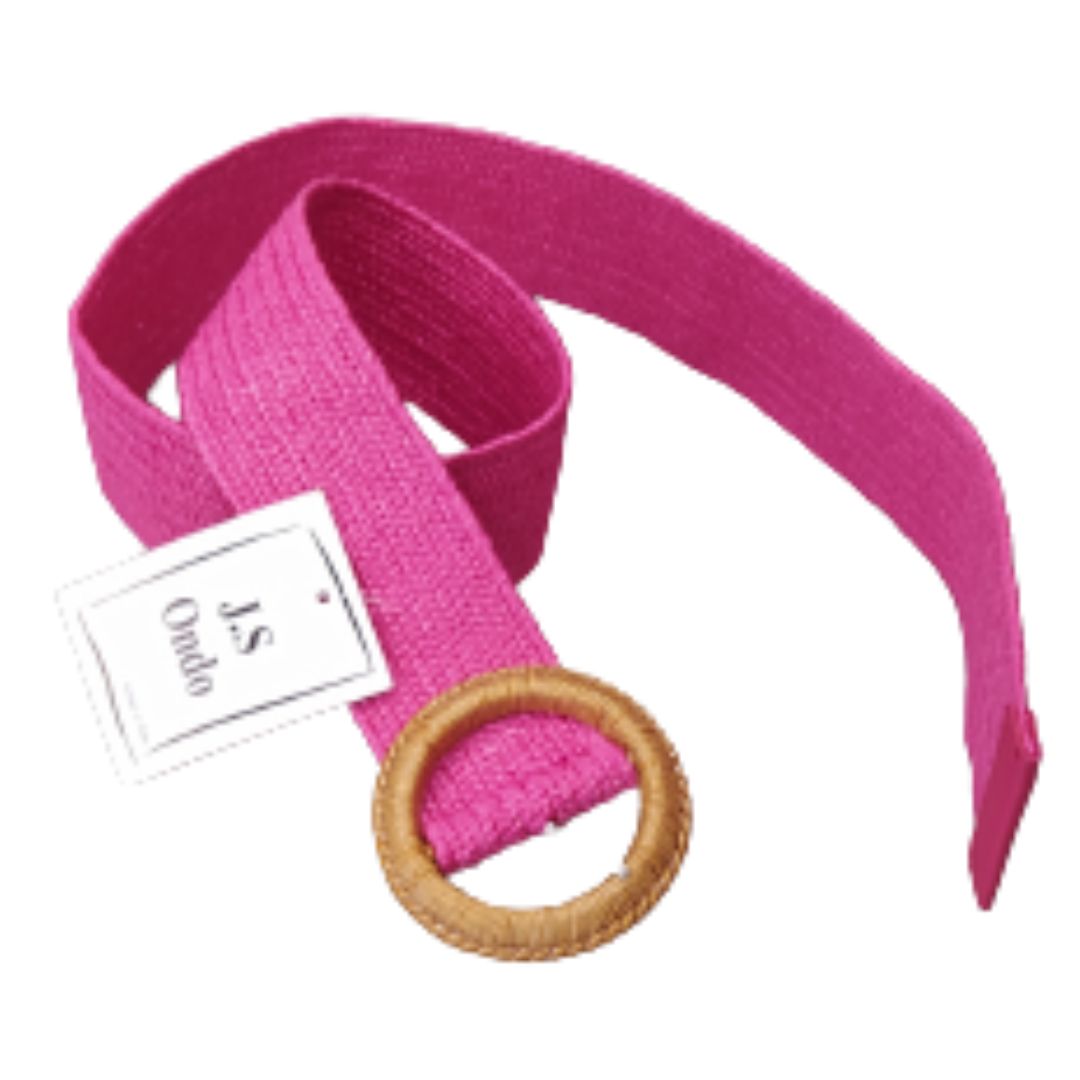Cinturón de poliéster efecto rafia, de color fucsia, con hebilla redonda estrecha, forrada de efecto rafia, en color tostado.