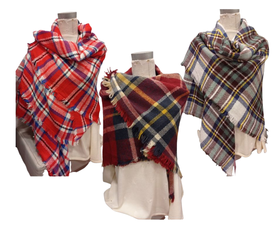 Bufanda cuadrada de cuadros, disponible en tres colores, rojo, granate y azul. El tamaño permite envolverte el cuerpo como un chal.