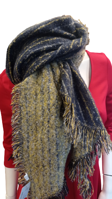 Budanda de rayas de doble uso cada cara es distinta. Azul oscuro con rayas en una cara. Mostaza con rayas en la otra cara. Versatil.
