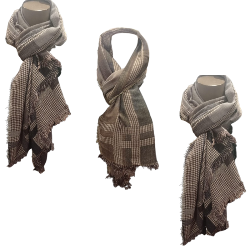 Bufanda de Caballero con amplios cuadros combinando distintos tonos de color. Disponible en color gris, beige y verde.