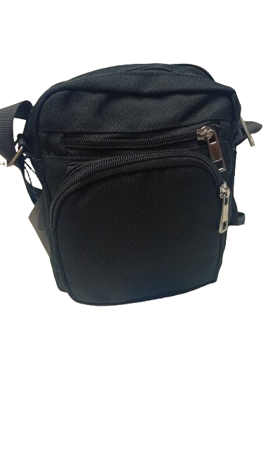 Bolso pequeño de hombre. En color negro y bandolera. dos compartimentos exteriores con cierre de cremallera.