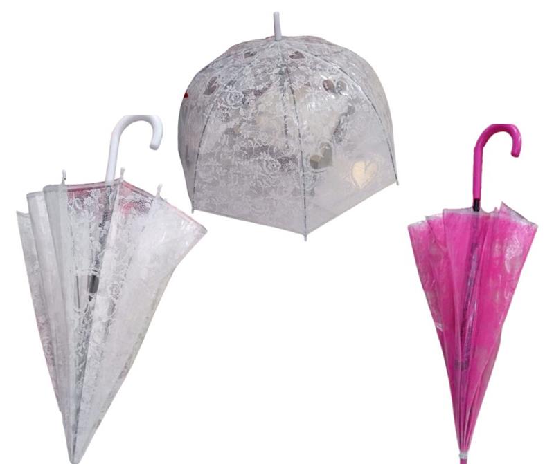 Original paraguas de plástico transparente, con flores blancas o rosas. Sus medidas: alto 82 cm; diametro por dentro: 81 cm; desarrollo copa 114 cm.