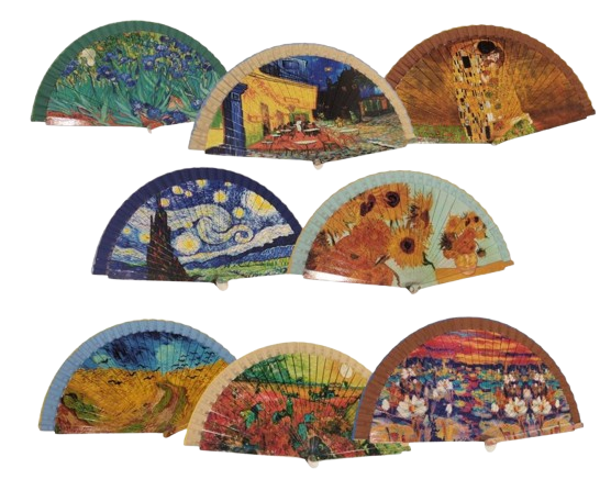 Abanico de madera con reproducciones de cuadros de pintores del Impresionismo. Van Goht, Klimt, Monet