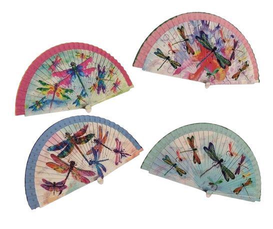 Abanico grande de madera con dibujo de libelulas en varios colores