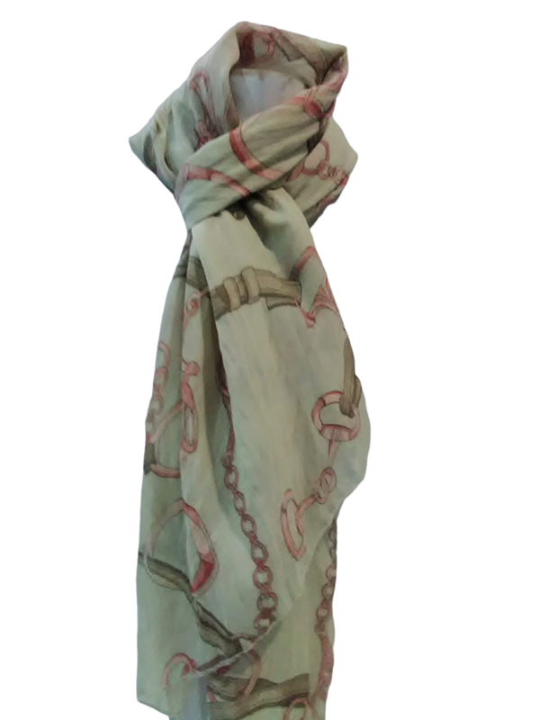 Pashmina de algodón y seda, de color beige con dibujo de estribos y cadenas, tacto suave y agradable. Da a tu outfit un toque especial. Medidas: Largo 160 cm. Ancho 60 cm