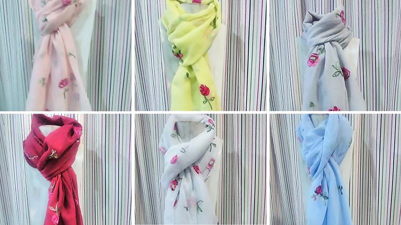 Pashmina de algodón con flores bordadas salteada, de algodón y viscosa ligeras y suaves. Disponible en varios colores: blanco, amarillo, rosa, azul cielo, granate.