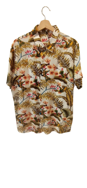 Camisa para hombre de manga corta, blanca con dibujos de hojas en colores verdes y rojos. De rayón con tacto muy suave y agradable. Disponible en varias tallas que abarcan estas medidas: contorno de pecho de 108 cm a 120 cm. Contorno de cadera 108-120 cm. Largo 81 cm. Contorno de brazo 46-52 cm.
