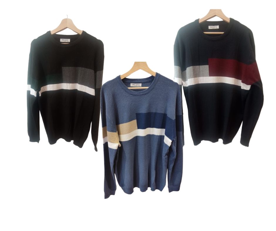 Original estampado para jersey de hombre, con franja de rectángulos, en diversos colores (negro-granate, negro-grises, azul claro-azul marino) Tallas de la 2XL a la 5XL. Contorno de pecho 108 a 120 cm. Contorno de cadera 108 a 120 cm. Largo 74-76 cm. Contorno de brazo 52 a 58 cm