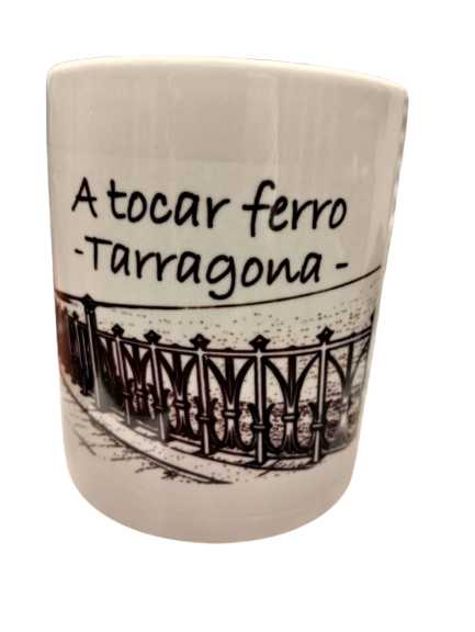 Taza de cerámica souvenir de Tarragona con la frase típica “A tocar ferro”. Llévate un pedacito de la tradición tarraconense contigo. Un guiño a la costumbre de tocar el brazo de hierro del paseo marítimo para atraer la suerte.