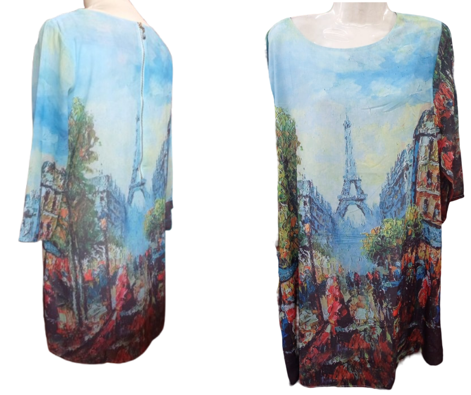 Vestido recto estilo tunica en color morado con estampado de la Torre Eiffel de Paris. Tallas grandes.