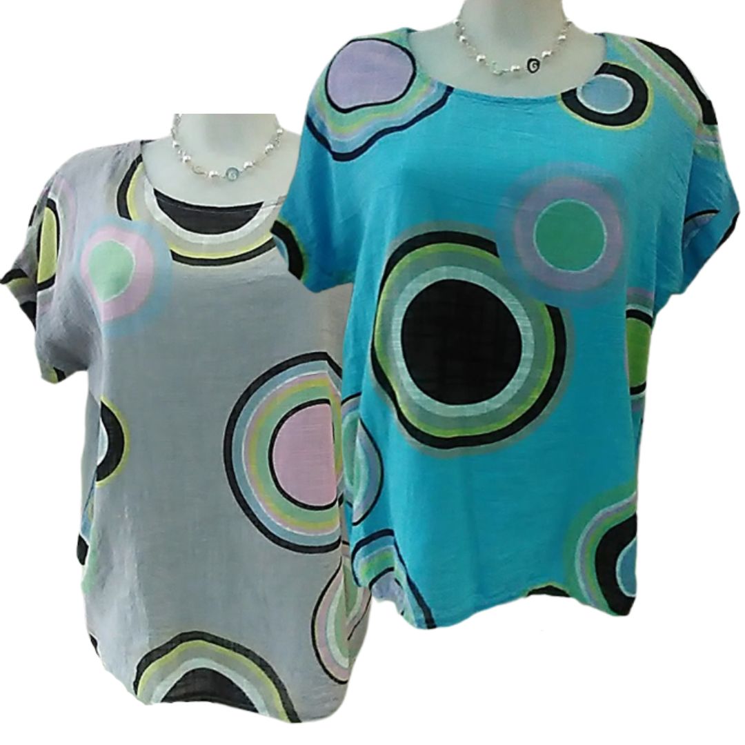 Blusa con cuello redondo y mangas amplias, ideal para combinar con pantalones o falda. Estampada con círculos grandes de distintas colores.