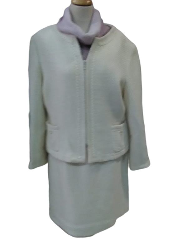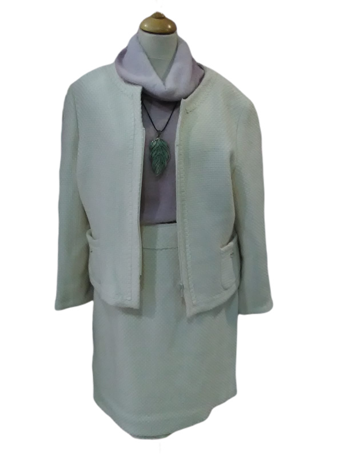 ¿te gustan los trajes chaqueta? ¿te gusta Cocó Chanel? Este conjunto tiene una inspiración a ese modelo clásico. El color blanco roto da juego para combinar con blusas de distintos colores.