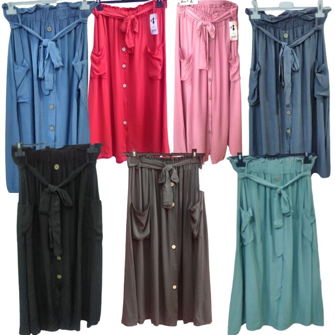 Falda semi-midi abotonada por delante, cinturón con lazada, y con bolsillos exteriores sobrepuestos. Es evasé y ligera. Disponible en los siguientes colores. negro, azul cielo, gris claro, gris oscuro, verde agua. Ideal para llevar con lencera.