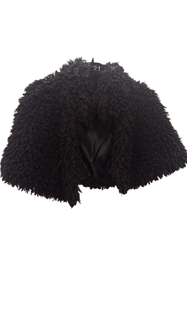 Chaqueta estilo capelina en color negro, de tacto suave especial para acompañarte a eventos especiales. Está forrada por dentro. Válida hasta talla XL: contorno de hombros de 84 cm, contorno de pecho de 140 cm, largo 40 cm.