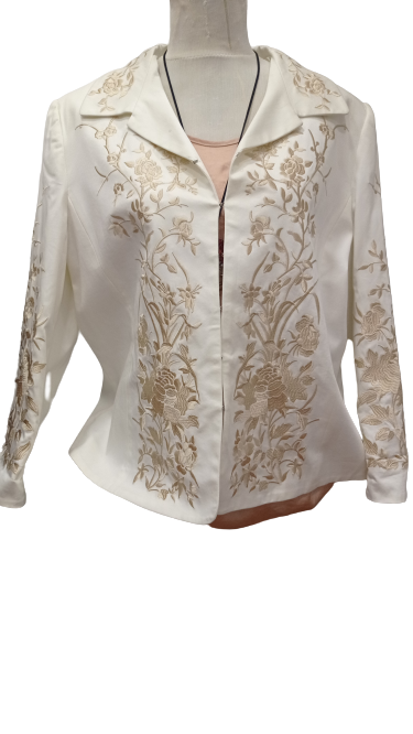 Chaqueta estilo americana corta, blanca con bordados dorados. Elegante y sofisticada. En Talla Grande; Contorno de pecho 116 cm. Contorno de cadera 116 cm. Largo 66 cm.