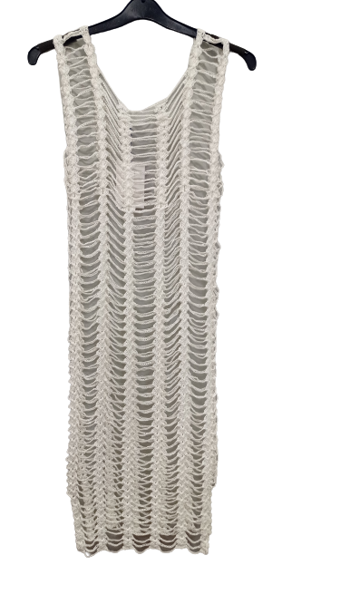 Vestido artesanal, sin mangas, hecho a mano con telido de Crochet. Vestido playero, fresco y divertido. Para llevar en la playa o la piscina.