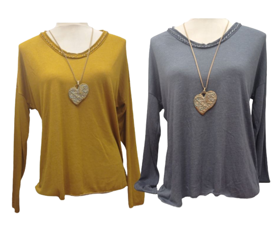 Camiseta en colores lisos, azul petrolero y mostaza. De manga larga, camiseta informal. En talla grande.