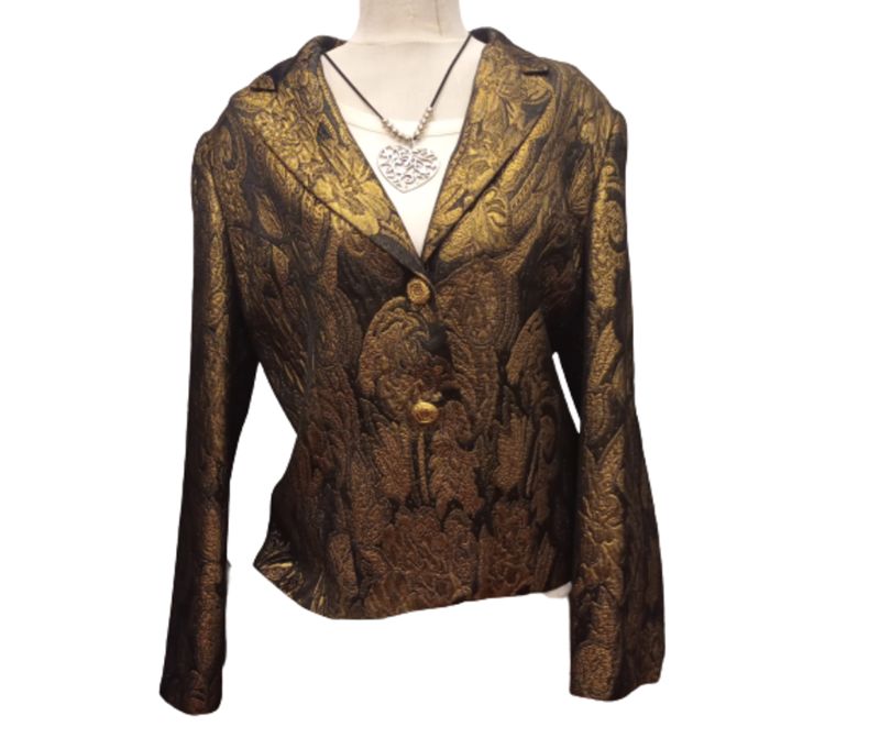 Chaqueta Americana en tono dorado envejecido, con estampados de "oro" para confeccionar un elegante outfit en talla grande. Contorno de pecho 112 cm. Contorno de cadera 120 cm. Largo 64 cm