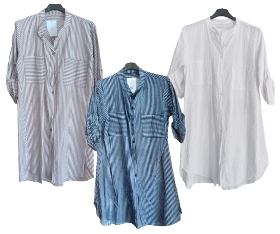 Una prenda cómoda de algodón y con estilo para cualquier ocasión. Con su diseño a rayas, este vestido camisero tiene un aire clásico y sofisticado que lo hace ideal para el trabajo o para un evento más informal. Puedes llevarlo también como blusón largo.