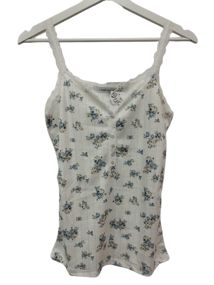 Camiseta de Tirantes con Encaje y Estampado Floral. Fresca, ligera, comoda y elegante. Encaje delicado que realza tu estilo. Estampado de flores vibrante y femenino