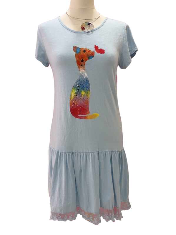 Vestido 100% algodón de manga corta, acamisetado, con volante grande bajo cadera ribeteado con puntilla. Color azul con dibujo pintado a mano, de un gato de colores besando una mariposa.