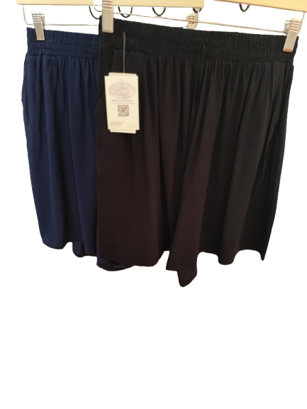 Cómodo y fresco pantalón corto, amplio y de tacto suave característico de la viscosa, disponible en varias tallas y en dos colores: negro y azul marino.