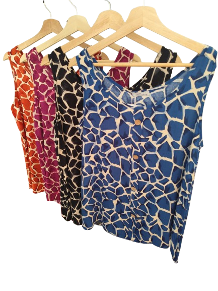 Blusa amplia evasé de tirantes, fresca y de tacto muy suave. Su estampado en cebra con rayas blancas, le da un toque original con colores muy combinables: rojo, fucsia, negro y azul rey.
